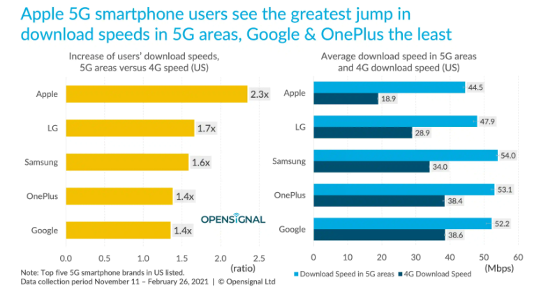 OpenSignal分享了一份新报告,该报告显示了来自美国的Apple,Google和Samsung等手机的5G性能。苹果用户的下载速度增长最快,是4G下载速度的2.3倍。报告显示,与Android手机相比,苹果的下载速度最慢。苹果目前仅拥有提供5G连接的iPhone 12系列。OpenSignal预计将更新配备5G的iPad Pro,据称其可提供与iPhone 12一样快的5G速度。