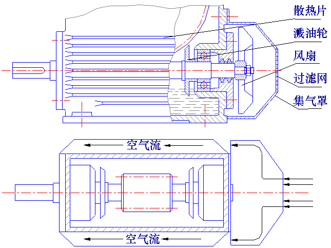 2)在蜗杆轴端加装风扇(图<加散热片和风扇的蜗杆传动>)以加速空气的流通。