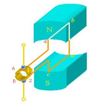 若把电刷A, B接到一直流电源上,电刷A接电源的正极,电刷B接电源的负极,此时在电枢线圈中将有电流流过。如图所示为直流电动机的简化模型。
