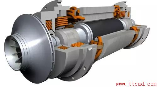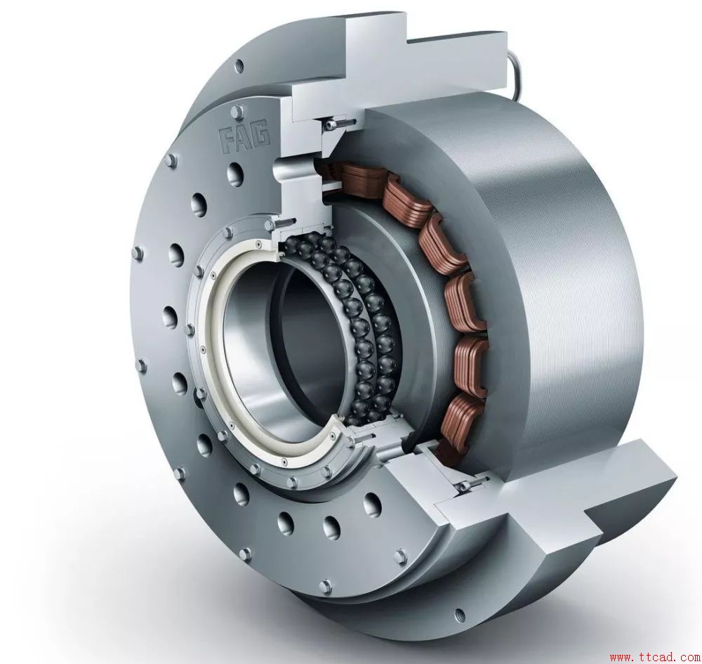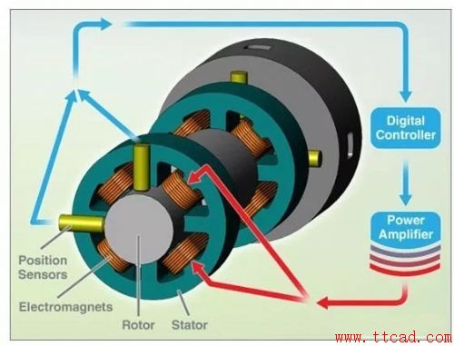 电磁铁布置成径向轴承和轴向轴承的形式,并提供磁拉力以抬起旋转机器的转轴。电磁铁中的电流由一个精确的数字式控制柜调节,提供磁力随时应对外部负载的变化以保持转轴良好居中。这样,转轴被无接触抬起,而且轴承的刚度和阻尼均可由一个数字式控制柜来调节。这些特点增强了高速旋转机器的性能,使设备具有高可靠性、低能耗的显著特点。