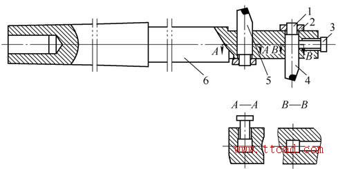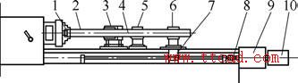 1. 机床的基本结构和组成部件 在车床基础上增加相应部件,以便达到镗孔、扩孔和滚压的目的。在加工时,被加工的工件旋转,刀具完成进给,镗孔时切削液经镗杆尾端(钻杆箱主轴尾部)进入镗杆内孔、到达刀具切削区,润滑、冷却切削区,裹带切屑在工件的床头端经排屑斗流入切屑箱。粗镗时,孔径精度IT8-10,表面粗糙度值Ra=3.2~6.3μm。精镗时,孔径精度IT7-9,表面粗糙度值Ra=1.6~3.2μm。 机床的主要组成部分如下: ( 1 ) 床体部分。借用原CW61125车床床体,后端可接长床体,导轨面中频淬火,整体通磨。 (2)床头箱部分。借用原CW61125车床床头箱,齿轮、轴承检修,换件另计。 (3)镗头支架。采用两个下半瓦结构,通过支撑套支撑镗杆,正前面有按钮板及仪表,几乎包含了机床的所有运动的控制按钮,因此,镗头支架也是机床的操作中心。机动快速装置带动镗头支架沿床体前后进给。如图1所示为镗刀杆装配示意图。刀杆上装两把可调镗刀,图中镗刀4用于将工件上的孔粗镗,精镗刀5用于将工件上的孔精镗,保证工件一次进给能进行粗、细加工。加工时,主轴带动镗刀转动,工件横向固定不发生变动,由车床托板沿纵向左移动,完成工件内孔粗、精加工。完成后,沿纵向向右退刀。