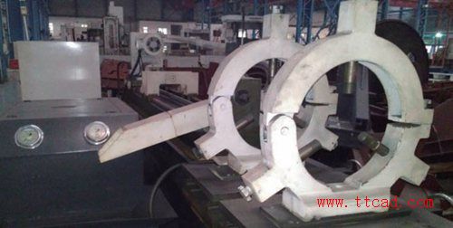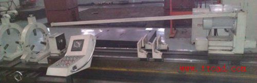 图2 镗刀进给装置示意图 1.镗刀组合件 2.管件 3.绶油支撑架 4.镗杆 5.镗杆支承架 6.镗杆固定支架 7.丝母箱 8.离合器 9.减速机 10.电动机 (6)进给系统。进给箱安装在床身的尾端,进给丝杠安装在导轨之间的凹槽内。由交流伺服电动机驱动,丝杠可得到0.5~60r/min的无级调速,拖板得到5~600mm/min的速度。 (7)中心架、工件托架。借用原车床中心架、工件托架。 (8)切削液供应系统。切削液供应系统在机床的后面,主要的组成部分有油箱、输油管、储屑箱及泵站等。切削液的主要作用有两点,第一点是冷却的作用,第二点是清除切屑排往储屑箱和油箱。冷却系统的液压是由1个电动机带着1个齿轮泵组成,可提供300L/min的流量,具有冷却过滤功能。 (9)排屑斗。增加专用的排屑斗,可把切屑和切削液自动排入切屑箱内,防止切削液的飞溅。 (10) 电气部分的控制系统。主要有电气控制系统、电气控制柜及驱动装置等。 2. 机床的基本技术参数 ( 1 ) 镗孔最大直径: 500mm;中心高度(从平导轨至主轴中心):同原机床;最大加工工件长度:4 000㎜;主电动机功率:与原车床相同;进给电动机功率:5kW;机床主轴级数、转速:与原车床相同;拖板电动机:5kW、N=2 880r/min;进给速度范围:0~600mm/min;拖板快速移动速度:2.8m/min;冷却泵电动机:5kW、N=960r/min;冷却系统额定压力:0.36MPa;冷却系统流量:200L/min。 (2)粗镗时,孔径精度: IT8-10,表面粗糙度值:Ra=3.2~6 . 3 μ m; 精镗时, 孔径精度: IT7-9,表面粗糙度值:Ra=1.6~3.2μm。 (3)进给速度:根据加工的具体情况而确定,一般在10~60mm/min;切削速度:一般是根据材料的硬度、刀具设计的结构及被加工工件的材质确定,一般在60~90m/min。加工现场如图3所示。