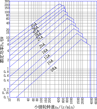 上图所示为A系列滚子链的额定功率曲线,它是在标准实验条件下得出的,设计时可根据小链轮的转速n1从图中查出这种型号的链条允许传递的额定功率P0,额定功率曲线适合于链速v>0.6m/s的场合。 滚子链的额定功率曲线是在以下标准实验条件下得出的: