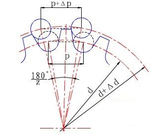 链节距增长量与节圆外移量的关系当销轴和套筒磨损后,链节距的增长量Δp和节圆由分度圆的外移量Δd有如下关系: